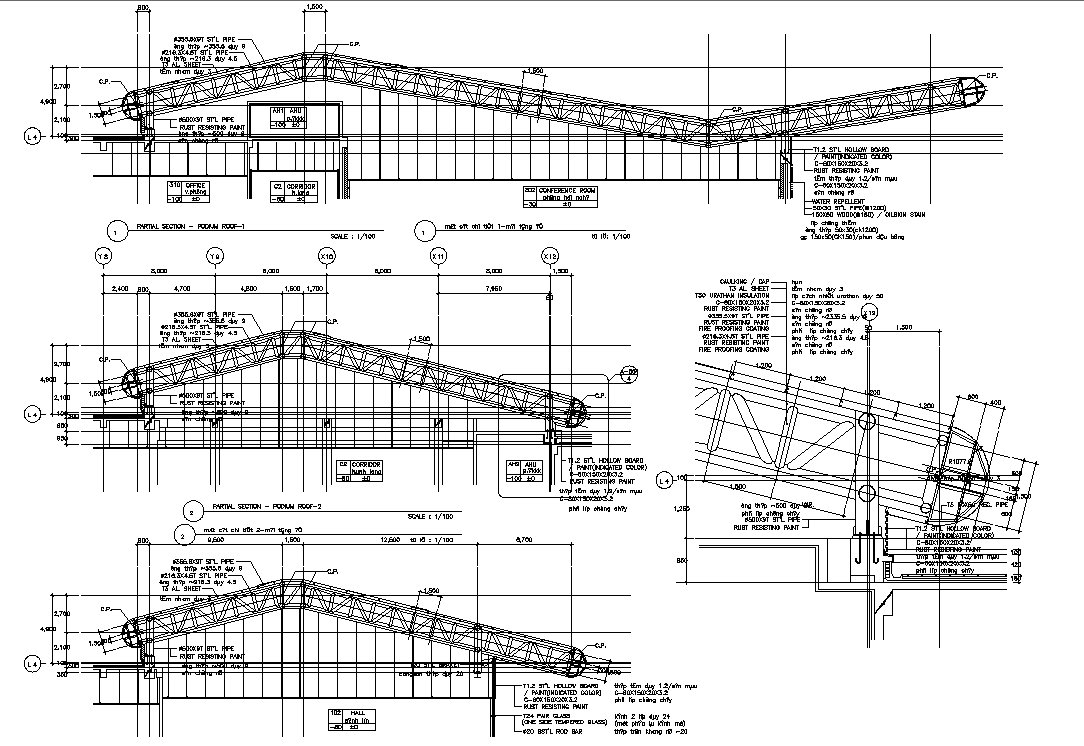 Drawing file Showing the details of the Partial floor plan and section design of the Podium steel roof. Corridor and Conference rooms are available in this building. And the staircase is available to the inside of the Building. A partial section of this podium roof is available. Download Autocad DWG file.