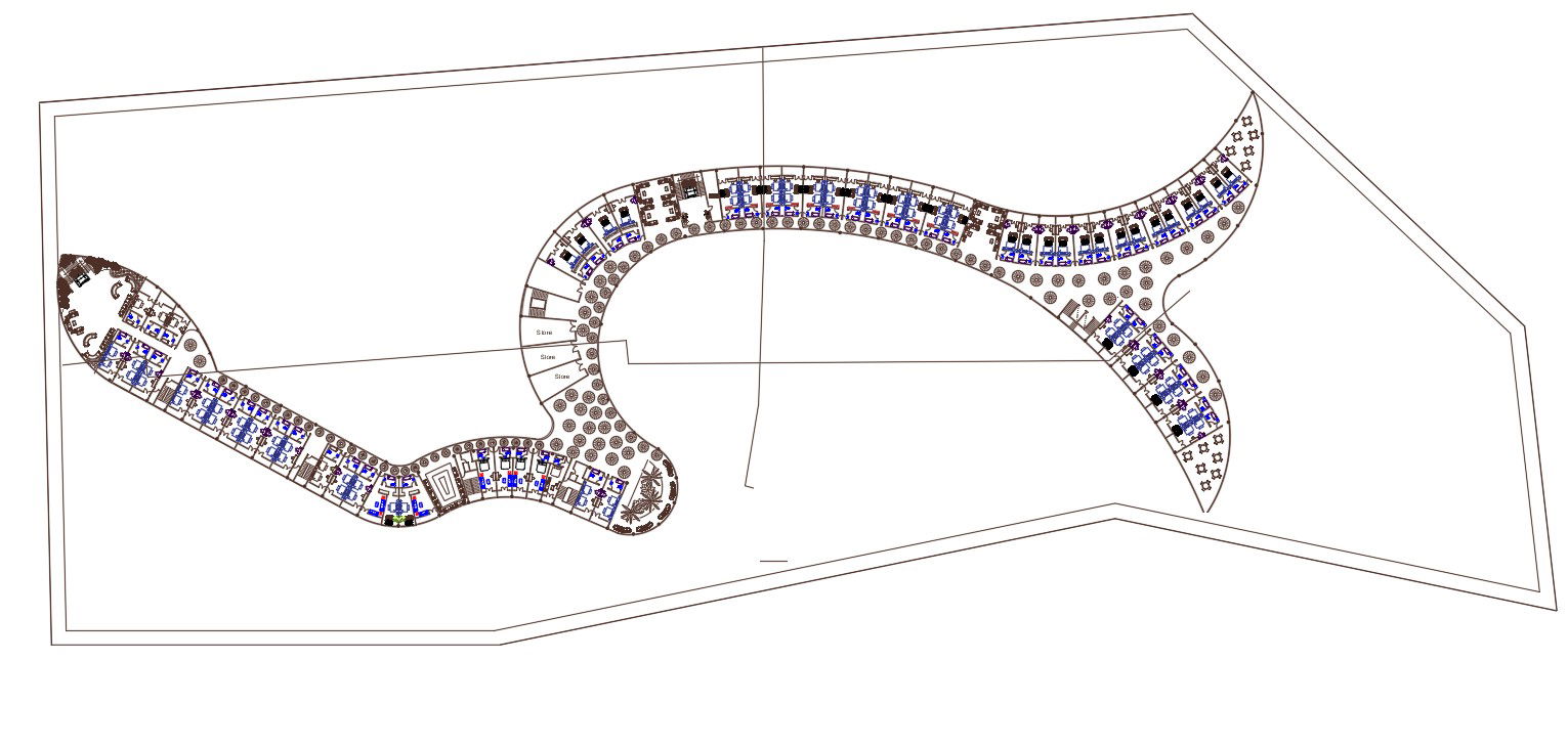 The hotel bedrooms floor plan design that shows multiple bedroom with furniture design, reception area, canteen and restaurant, and landscaping design. download hotel bedroom floor design master plan with furniture layout design DWG file.