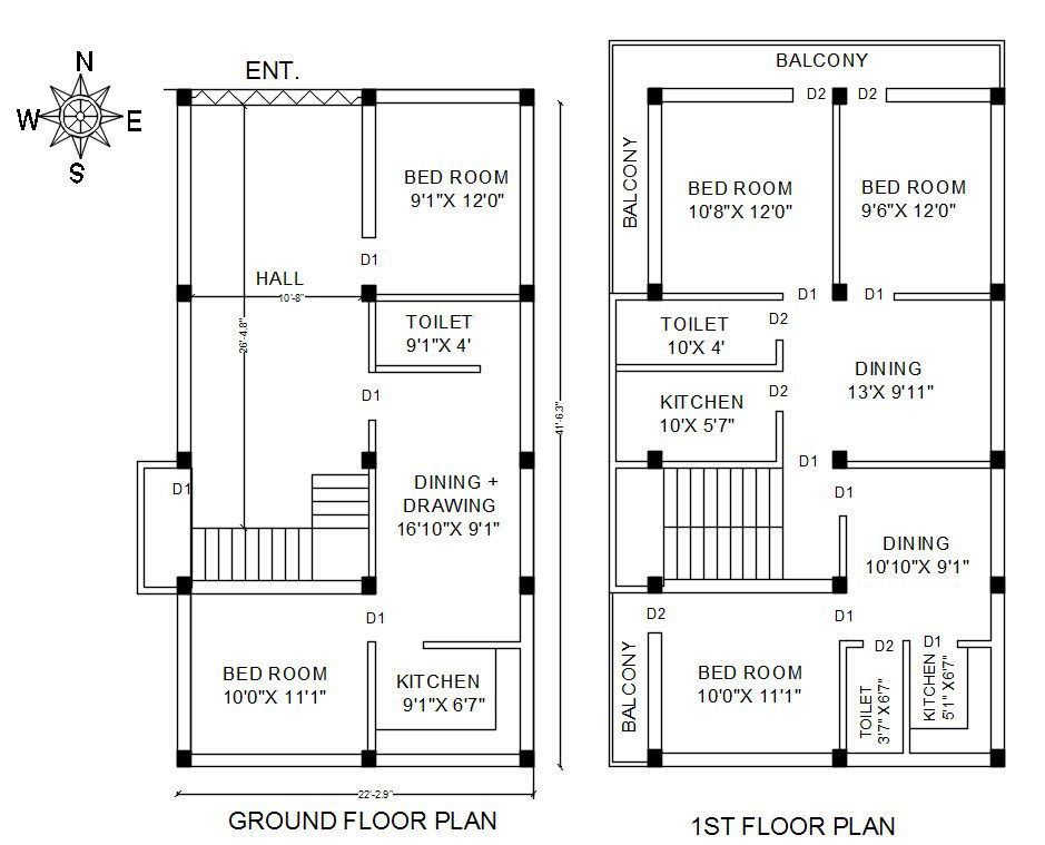 the north facing house vastu plan CAD drawing shows ground floor and first floor plan design that shows 2 BHK and 3 BHK plan with column layout design. download 22 X 41 feet plot size house plan with dimension and description detail DWG file.