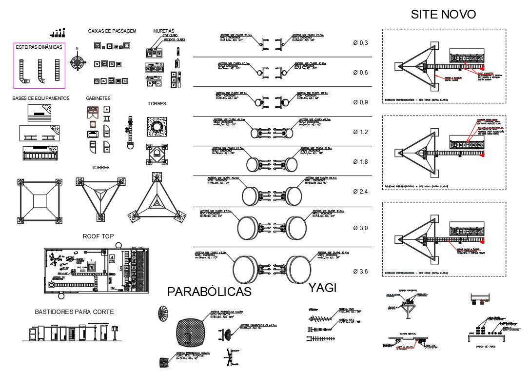 The drawing file shows the Different types of tower antenna design and equipment details. Download the Autocad DWG file to get these details.