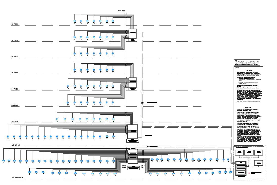 AutoCAD DWG Drawing file of G+7 floor building, Security system, CCTV camera, Access control, Intercom details. The main electrical connection details are given in this drawing file. Download the Autocad DWG file. Thanks for downloading the DWG files from our website.