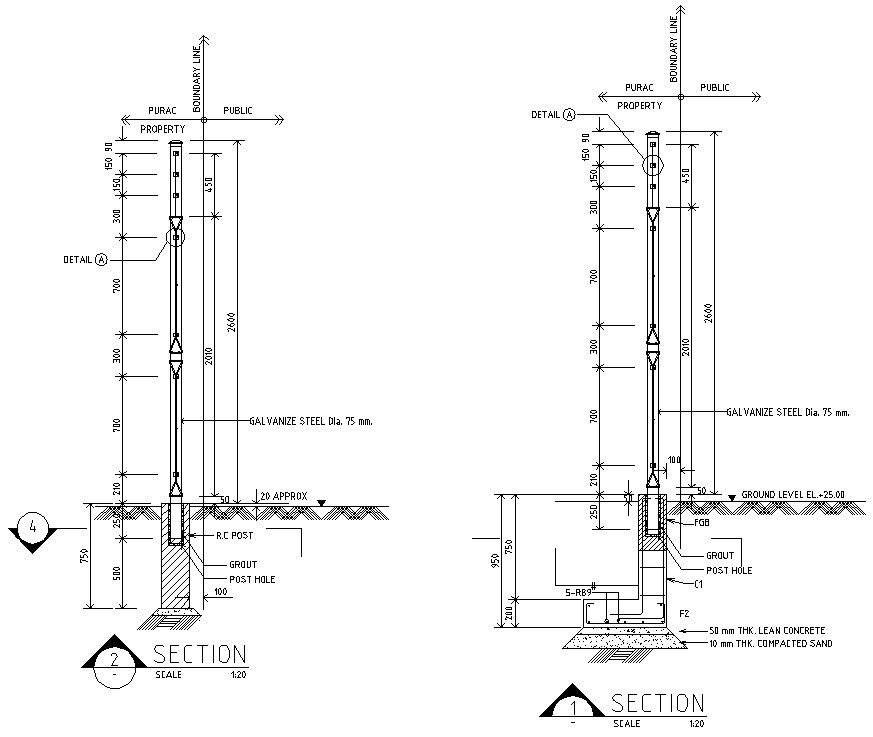 Download free DWG file of land property boundary wall section drawing that shows lean concrete and compacted sand with dimension detail.