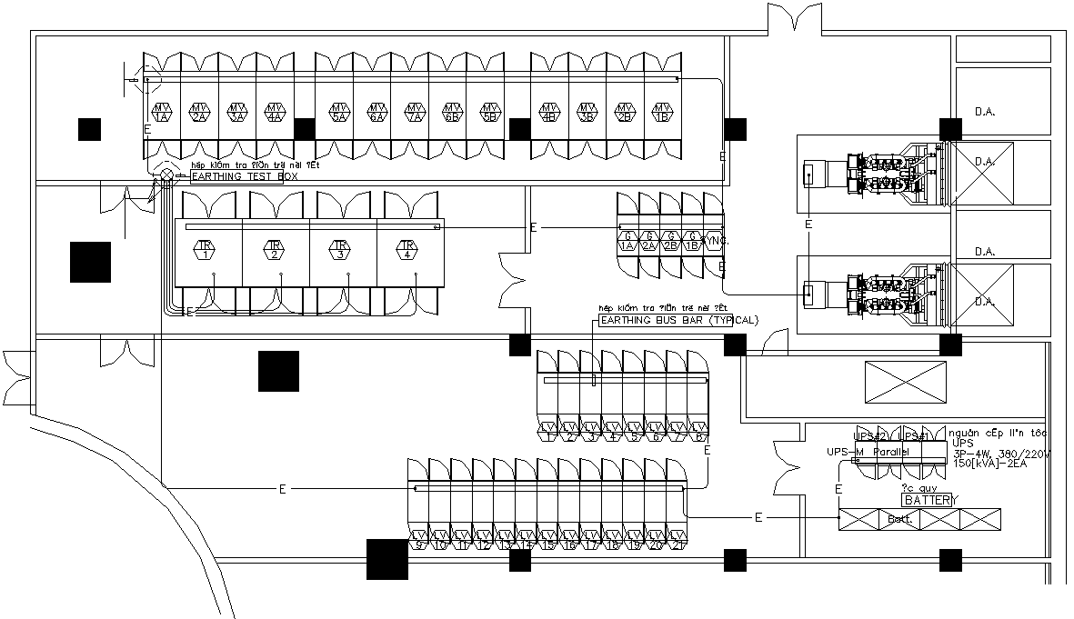 DWG drawing file shows the details of the electrical room grounding system details, Battery connection, UPS parallel, earthing bus bar, emergency light connection, Generator set details, Emergency generator set and diesel engine are marked in this drawing. Download the DWG file.