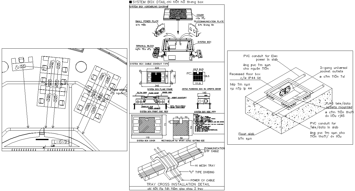 AutoCAD Drawing file showing the details of the Electrical System box section and elevation details. In the section plan, PVC conduit, power in the slab, Recessed floor box, floor slab, PVC conduit for tele/data in the slab , outlet mounted are the details mentioned,Download the dwg file.