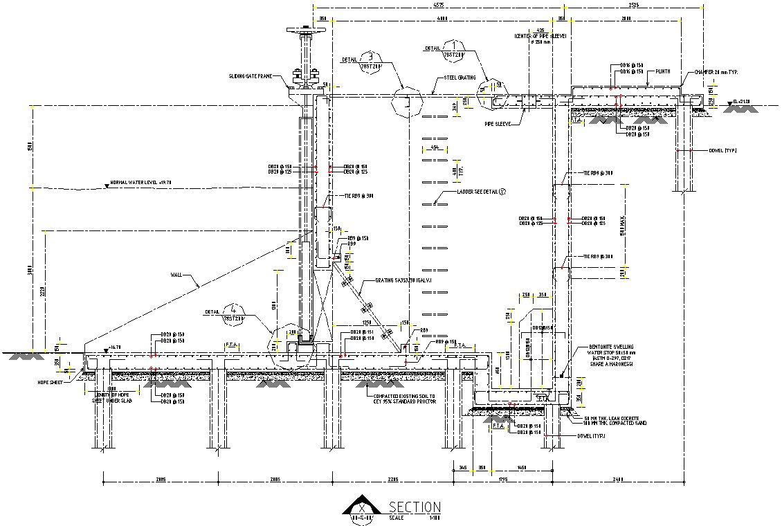 2d CAD drawing of industrial plant bentonite swelling water stop 50x50 mm, 50 mm thk an concrete and 100 mm thk compacted sand with pipe line detail.