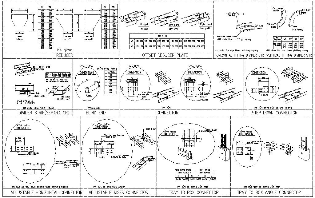 CAD DWG file showing the details of the cable tray detailed diagram, In the sectional plan, parts of the cable tray are noted in this AutoCAD Drawing file. reducer, offset reducer plate, horizontal fitting divider strip, vertical fitting divider strip, connector, blind end are mentioned in the section plan. Download the DWG file. Thanks for downloading DWG file from our website.