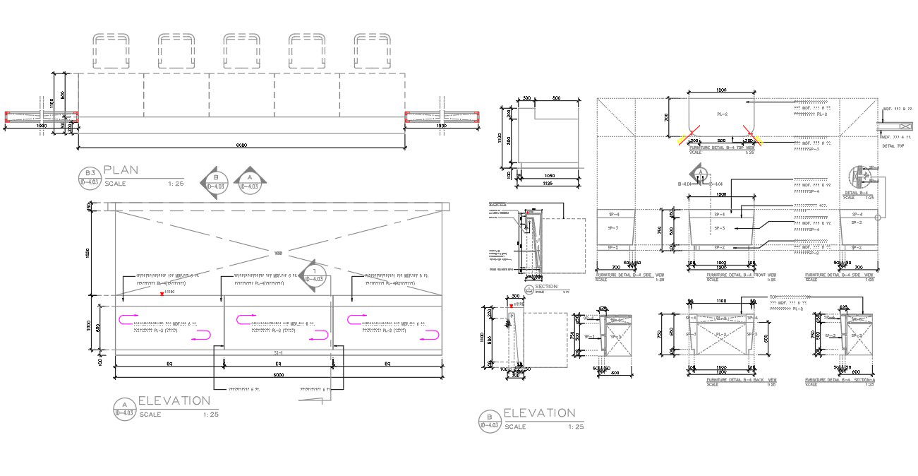 AutoCAD drawing of waiting counter plan with elevation design which consist Solid wood frame, MDF paneling, thickness 6 mm, Laminated with all furniture design. download waiting counter plan design AutoCAD file.