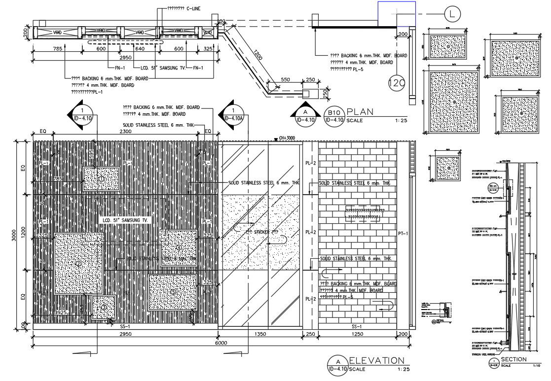 2d CAD drawing of wall backing 6 mm.THK. MDF board. Covered 4 mm.THK MDF BOARD. Covered with SOLID STAINLESS STEEL 6 mm. THK. Sign installation location Entrance to the bathroom. download office wall partition elevation design DWG file.