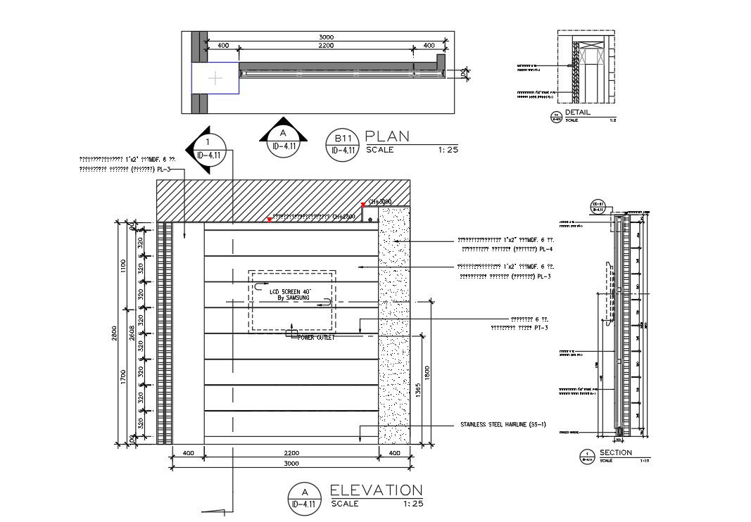 AutoCAD drawing file shows t V unit furniture design that shows top view plan, front elevation design, side section which consist solid wood frame 1 "x 2" MDF paneling 6 mm. Covered with laminate (light gray) PL-3, except for groove 6 mm and Spray painted black. download LCD Screen 40" by Samsung TV unit furniture drawing DWG file.