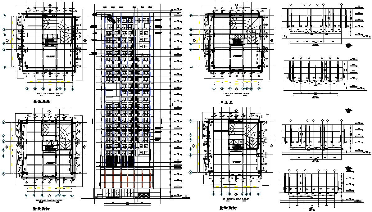 DWG AutoCAD file Shows the details of the diamond Facade of Shop drawing, a Total of four floors shops available in this building for all the four floors diamond facade section and elevation plan given in this drawing file. Download Autocad DWg drawing file.