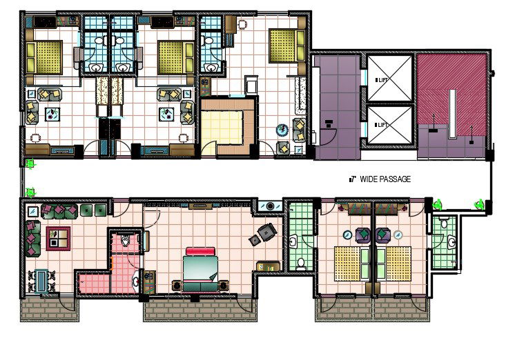 AutoCAD drawing of hotel bedrooms floor plan with furniture design that shows double bedrooms, deluxe bedroom and small bedrooms with flooring design and 7 feet wide passage. also has staircase and 2 lift facility. download hotel bedrooms floor plan detail DWG file.