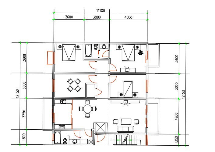 2d CAD drawing of 3 BHK house layout plan with center line dimension detail that shows furniture proposal of this work plan and number door window marking. download family house plan AutoCAD file and collect for ready to build construction drawings.