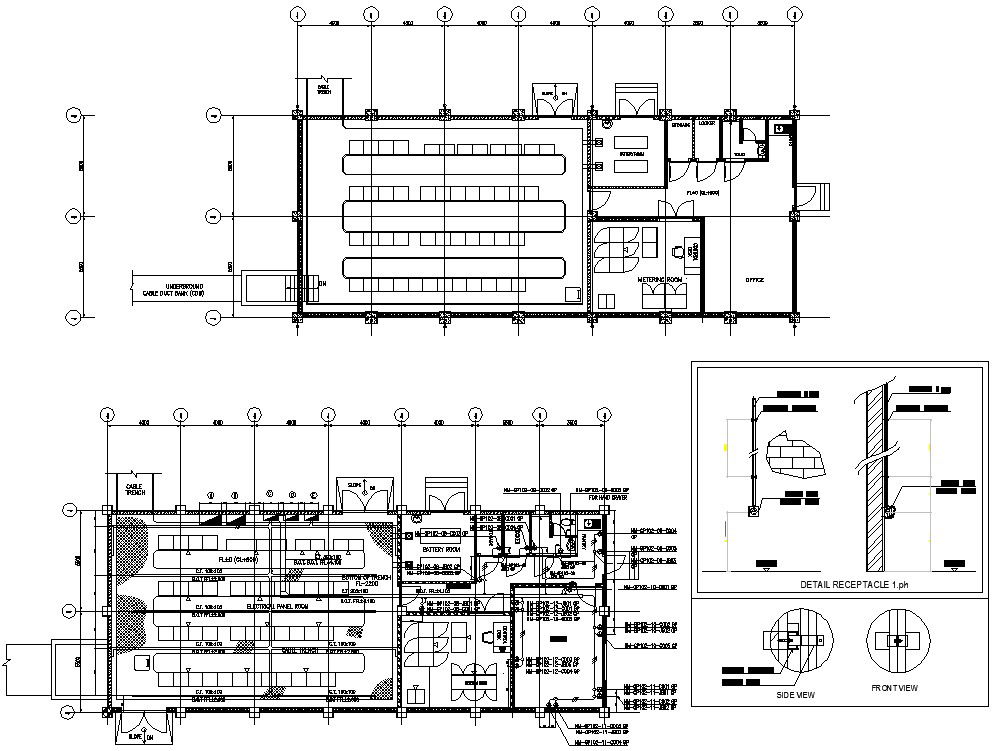 AutoCAD DWG file shows the Electrical room Duct details, In this drawing file, the underground cable connection details, Electrical panel room, battery room, front and side view of Receptacle detail are clearly mentioned. Download the AutoCAD 2D DWG file.