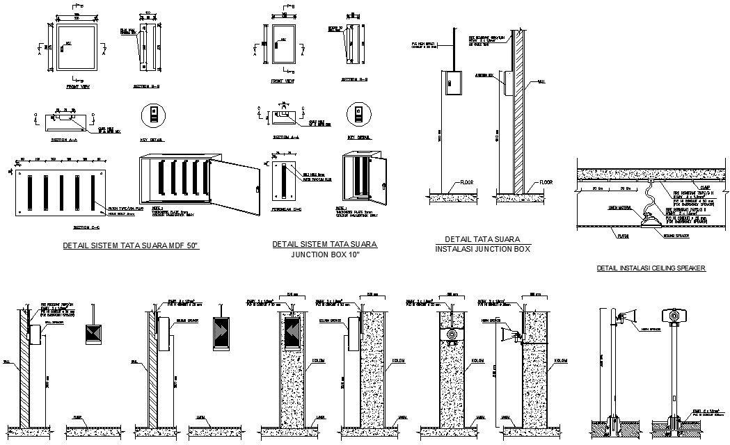 AutoCAD DWG file Shows the details of the sound system diagram. In the drawing file, sound system sectional detail, unit detail, socket outlet installation, distribution board installation, junction box are the details given. Download the AutoCAD DWG file. Thanks for downloading DWG Autocad Files from our website.