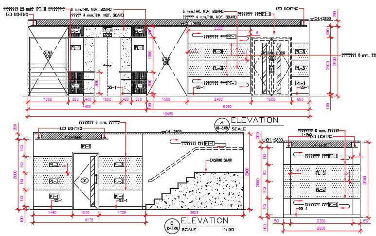 2d CAD drawing of office interior design design that shows all side elevation design which consist covered with solid stainless steel and wooden 6 mm thickness. glass partition wall and swinging door design. download office interior CAD drawing DWG file.