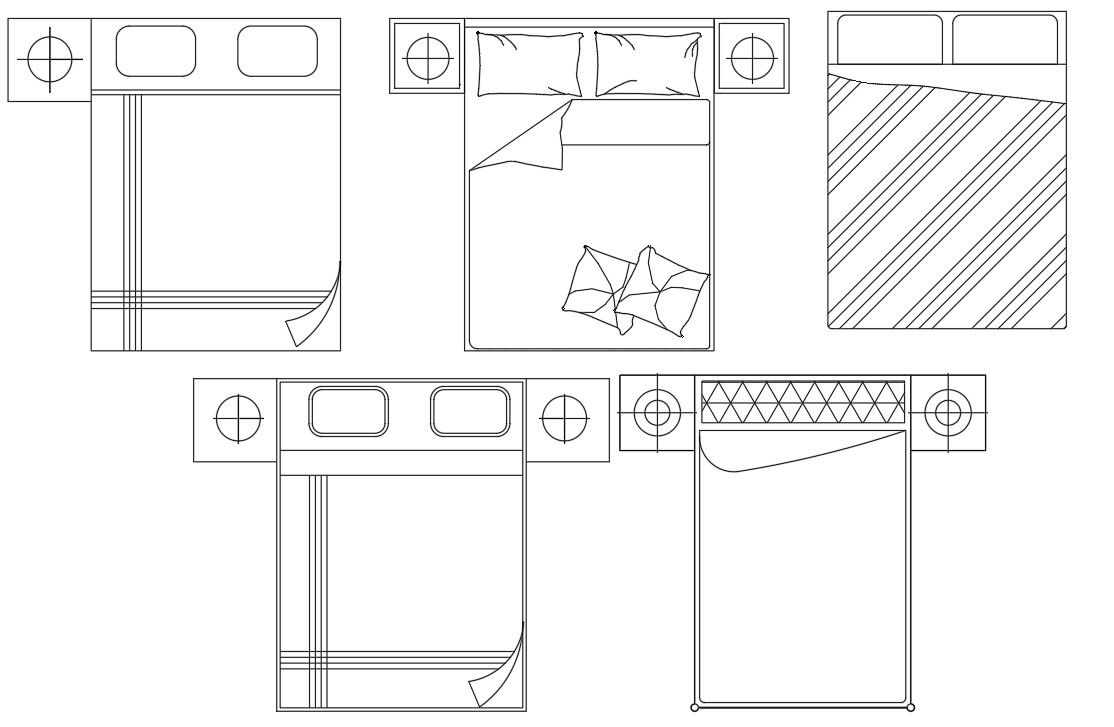 2d CAD drawing of double bed AutoCAD blocks which consist wood furnished headboard with and overlaps two bedside night lamp tables floating frame with a drawer that perfectly join the bed. download double bed AutoCAD blocks drawing DWG file.