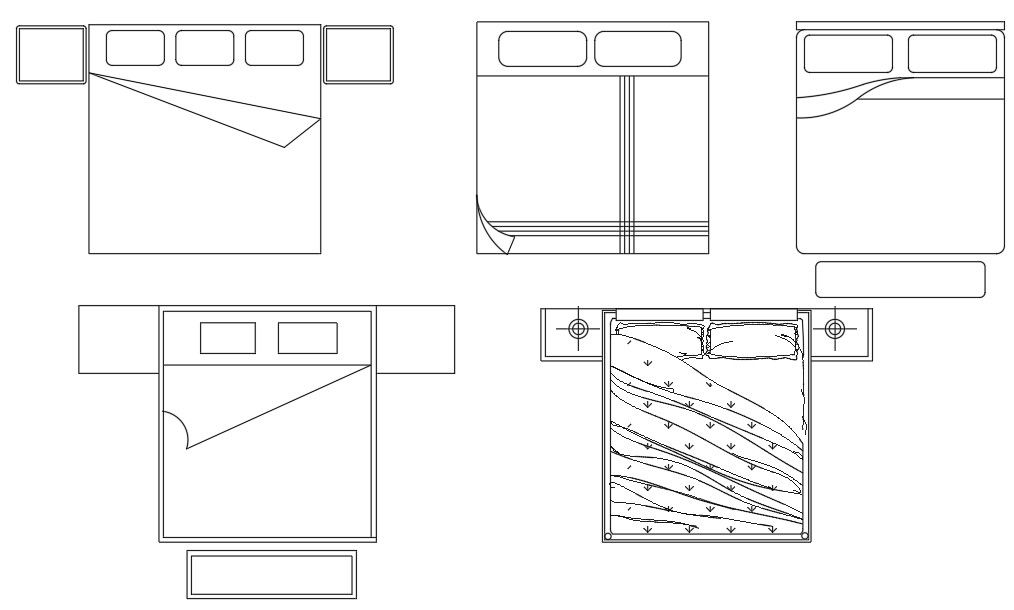 2d CAD drawing of double bed CAD blocks drawing with and overlaps two bedside night lamp tables containing wood and springs that provide additional support and suspension for the mattress. download free double bed CAD blocks design DWG file.
