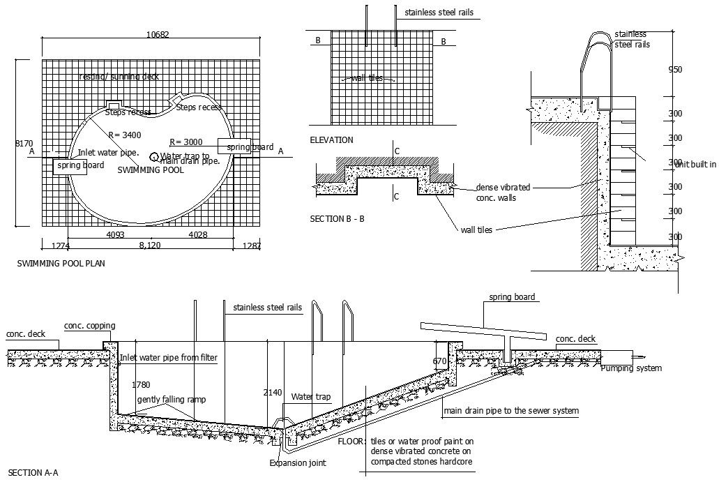 AutoCAD drawing files having the reinforcement details of the swimming pool. This file shows section and elevation details of the swimming pool. swimming pool handrail measurement details are also shown in the drawing. Download the AutoCAD 2D DWG file.
