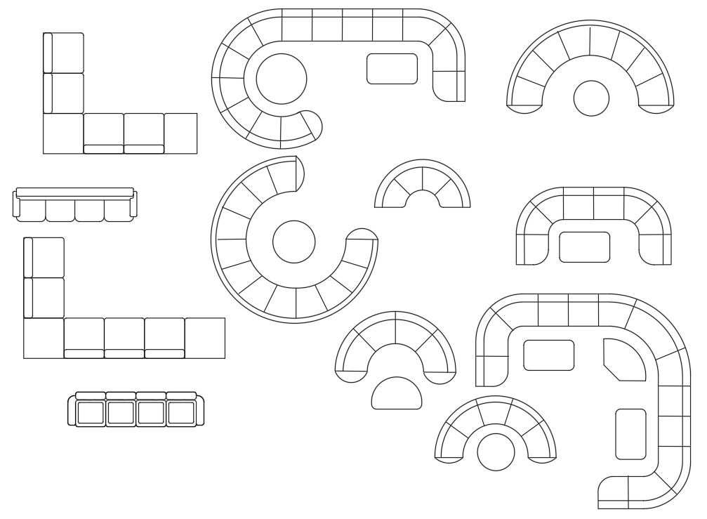 Find here I shape, L shape, round shape, and half round shape of furniture CAD blocks drawing. download multiple different design of sofa set furniture CAD blocks design DWG file
