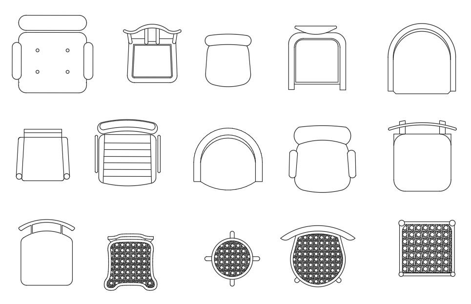 AutoCAD drawing of furniture chair different design CAD blocks which is made in wooden and steel, usually the four corners of the horizontal seat attached in turn to four legs of chair. download multiple chair CAD blocks design DWG file and use in office and home for comfort seat.