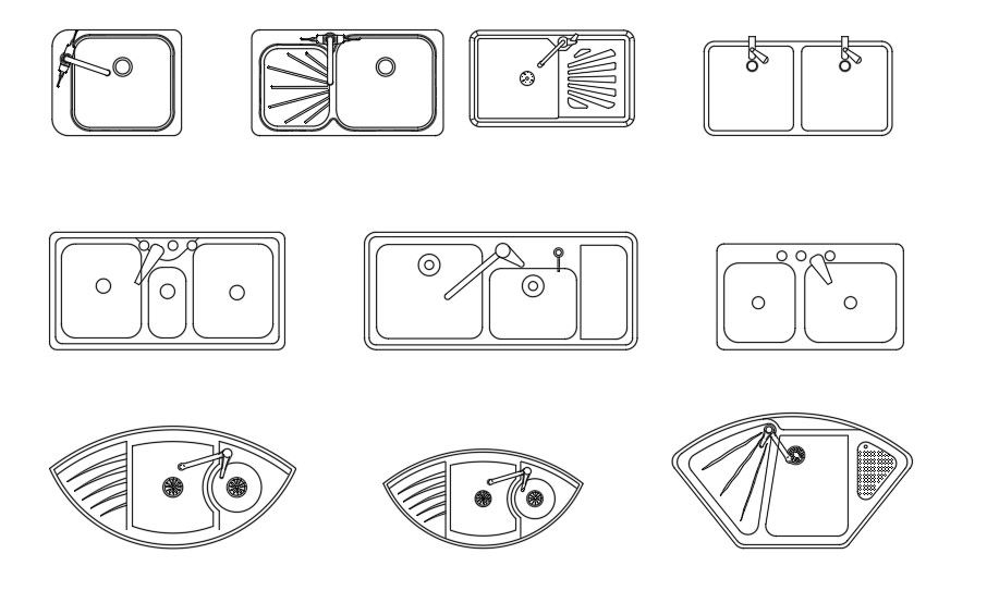 AutoCAD hardware blocks of kitchen single and double sink with tap design top view plan. there is common bowl-shaped plumbing fixture used for washing dish and hands. download free sink blocks design DWG file.