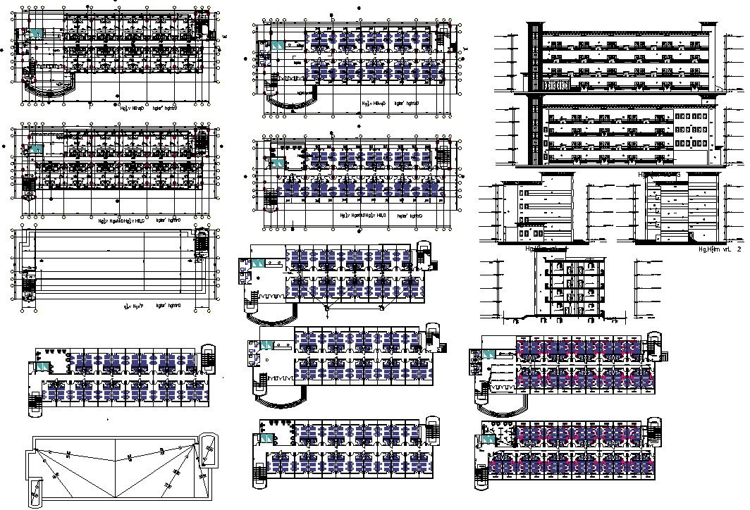 CAD Drawing files shows the seven floors' Sectional and elevation views with furniture Drawing in the building.