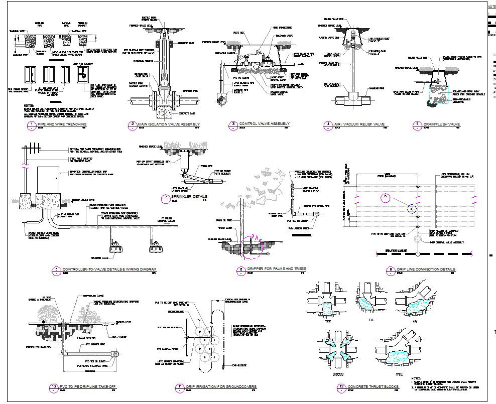 Finished Grade Level, irrigation level, Main line pipe, pipe and wire trenching, main isolation valve assembly, control valve assembly etc detail.
