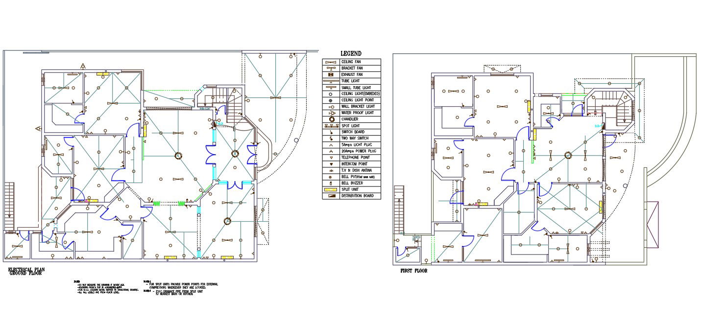 The drawing file shows the Electrical House plan 2D DWG file. In this Plan the Ground floor having a master bedroom with an attached toilet, Kid's bedroom with an attached toilet, patio, Drawing room, Kitchen, Dining, TV Lounge, Storeroom, lobby, porch, and Lawn are available. On the first floor, master bedroom with an attached toilet, Kid's bedroom with an attached toilet, Storeroom, patio, Lounge is available. The staircase is available inside the house. Download the AutoCAD Drawing file.