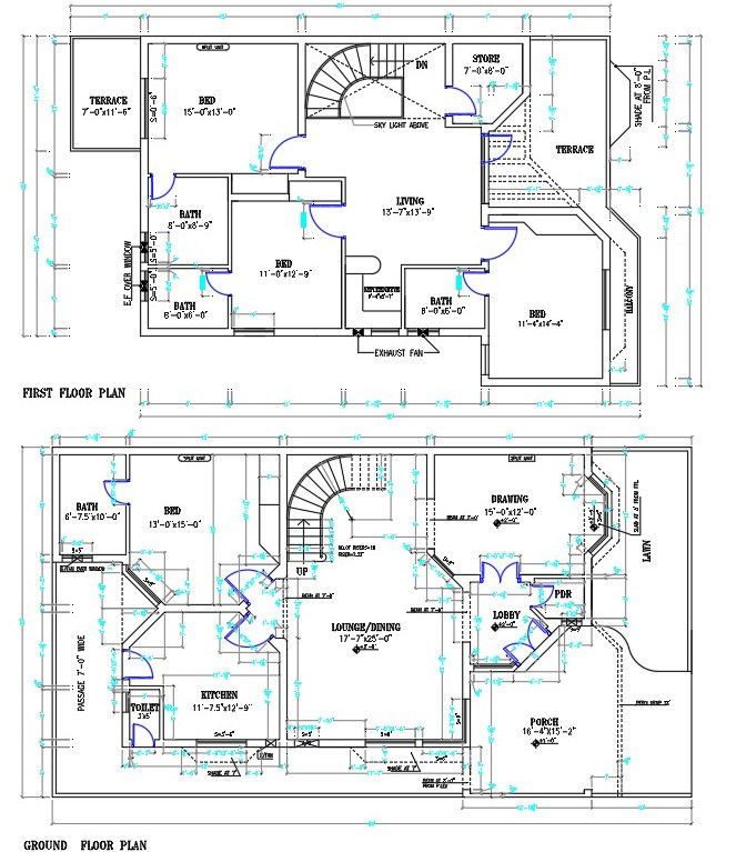 Working plan 2D Drawing file shows 35'X64' G+1 House plan triple bedroom DWG file. In this Plan the Ground floor having a master bedroom with an attached toilet, Kid's bedroom with an attached toilet, patio, Drawing room, Kitchen, Dining, TV Lounge, lobby, porch, and Lawn are available. On the first floor, master bedroom with an attached toilet, Kid's bedroom with an attached toilet, Guest bedroom with an attached toilet, patio, Lounge is available. The staircase is available inside the house. Download the AutoCAD Drawing file.