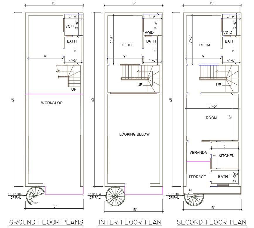 AutoCAD DWG file shows 15'X45' single BHK G+2 House plan . In-ground floor Workshop and toilet available.In the first floor Office and toilet available. On the second floor, master bedroom with attached toilet, Drawing room, Kitchen, Dining, TV Lounge, are available. The Staircase is placed inside of the house. Download the AutoCAD Drawing file.