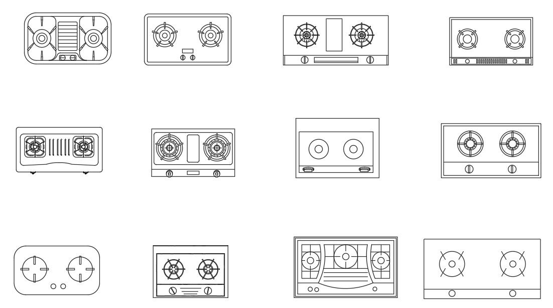 2d CAD drawing of free download kitchen gas stove different design that has 2 burner and 3 burner. There are some common types of kitchen stove CAD Blocks free download DWG file.