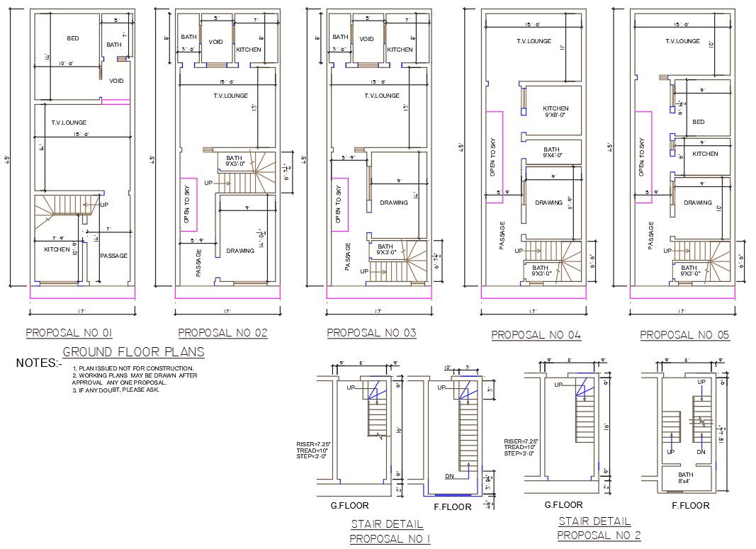 AutoCAD DWG file shows17'X45' Five Various types of single BHK House plan AutoCAD DWG file. In all Five plans building area is the same, room allocation and room sizes vary. In all plans master bedroom with attached toilet, Drawing room, Kitchen, Dining, TV Lounge, porch, and Lawn are available. The Staircase is placed inside of the house. Download the AutoCAD Drawing file. Thank you so much for Downloading AutoCAD DWG 2d files from our website.