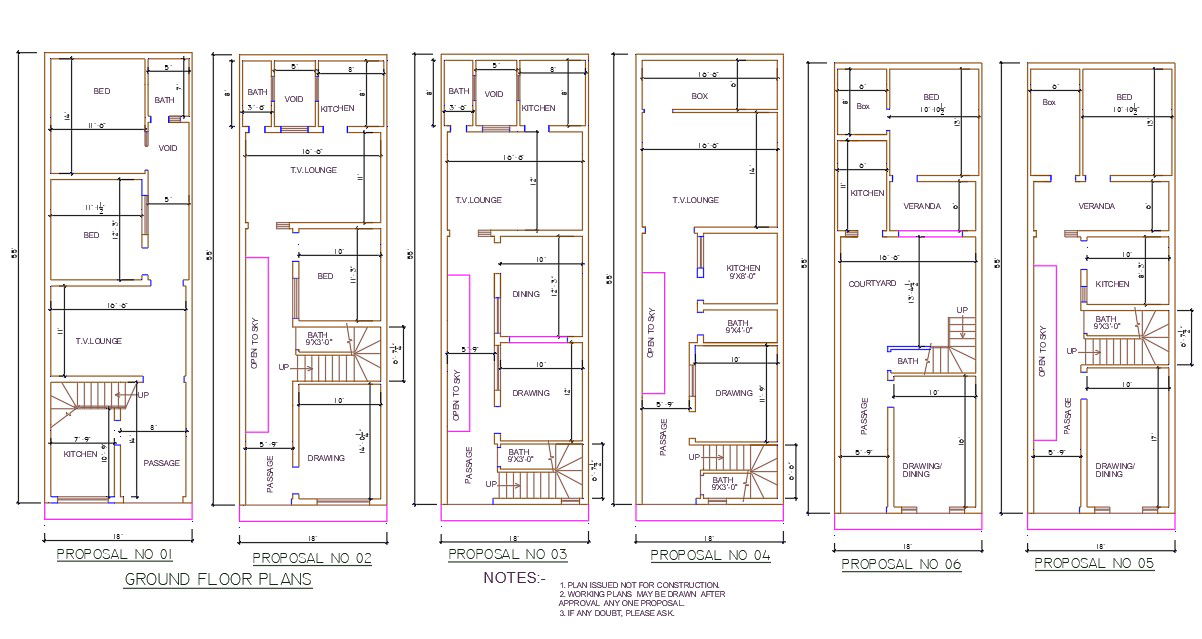 AutoCAD DWG file shows18'X55' Six Various types of single BHK House plan AutoCAD DWG file.