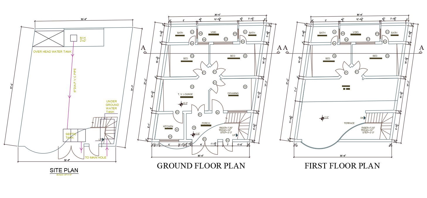 AutoCAD 2D Drawing file shows 30'X37' G+1 House plan 2D DWG file. In this Plan the Ground floor having a master bedroom with an attached toilet, patio, Drawing room, Kitchen, Dining, TV Lounge, Storeroom, lobby, porch, and Lawn are available. On the first floor, master bedroom with an attached toilet, Kid's bedroom with an attached toilet, Storeroom, patio, Lounge is available. The staircase is available inside the house. Download the AutoCAD Drawing file.
