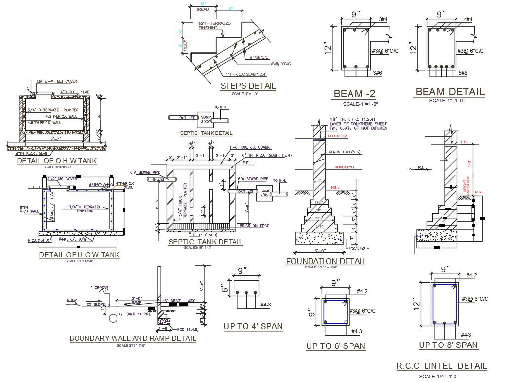 Autocad drawing file shows the Sectional Details of the septic tank, Boundary wall, RCC lintel details, U.G water tank, Foundation.