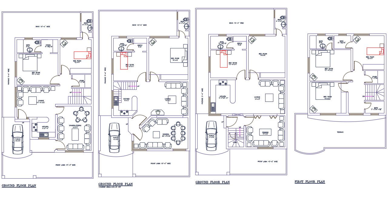 AutoCAD 2D DWG file shows 35'X64' Four types of double BHK House plan AutoCAD DWG files. In those 4 plans building area is the same, room allocation and room sizes vary. In all plans master bedroom with attached toilet, Drawing room, Kitchen, Dining, TV Lounge, porch, and Lawn are available. The Staircase is placed inside of the house. Download the AutoCAD Drawing file. Thank you so much for Downloading AutoCAD DWG 2d files from our website.