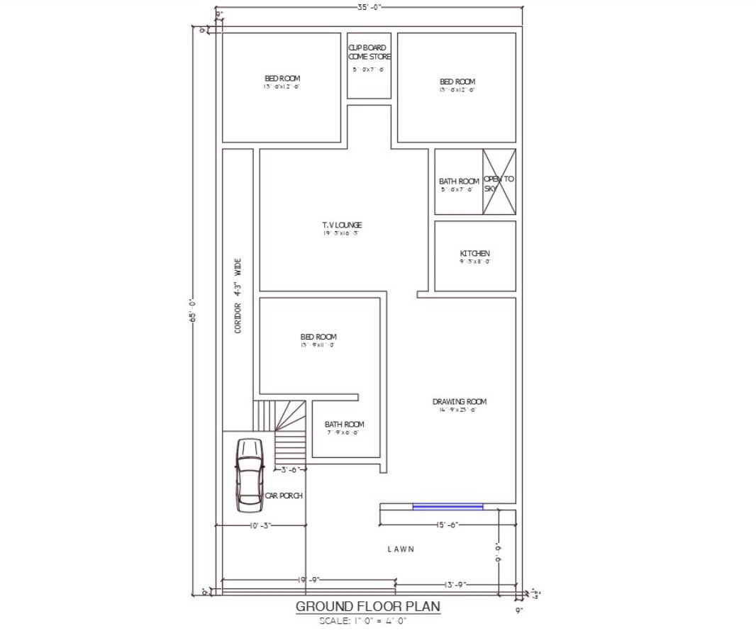 Drawing file of Single story ground floor 3bhk house plan of the sizes 35'X65'.Download Autocad DWG file.