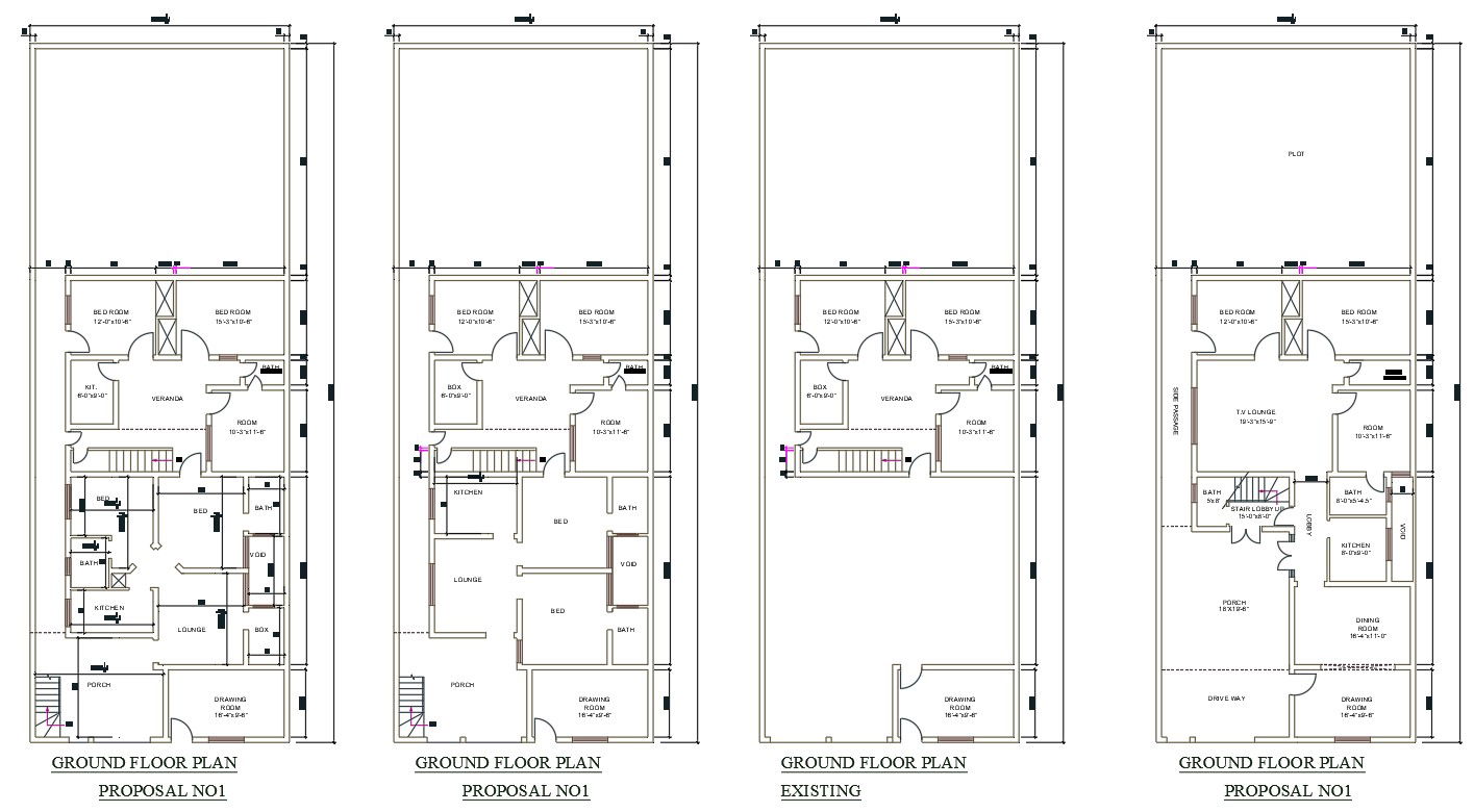 AutoCAD DWG file shows Four types of 36'X99' 2BHK House plan AutoCAD DWG files. In those 4 plans building area is the same, room allocation and room sizes vary. In all plans master bedroom with attached toilet, Drawing room, Kitchen, Dining, TV Lounge, porch, and Lawn are available. The Staircase is placed inside of the house. Download the AutoCAD Drawing file. Thank you so much for Downloading AutoCAD DWG 2d files from our website.