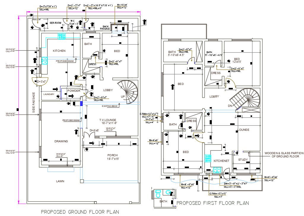 AutoCAD DWG Drawing file of 38'X63' double bedroom G+1 House plan . In this Plan the Ground floor having a master bedroom with an attached toilet, patio, Drawing room, Kitchen, Dining, TV Lounge, lobby, porch, and Lawn are available. On the first floor, rooms are also similar to the ground floor. The staircase is available inside the house. Download the AutoCAD Drawing file.
