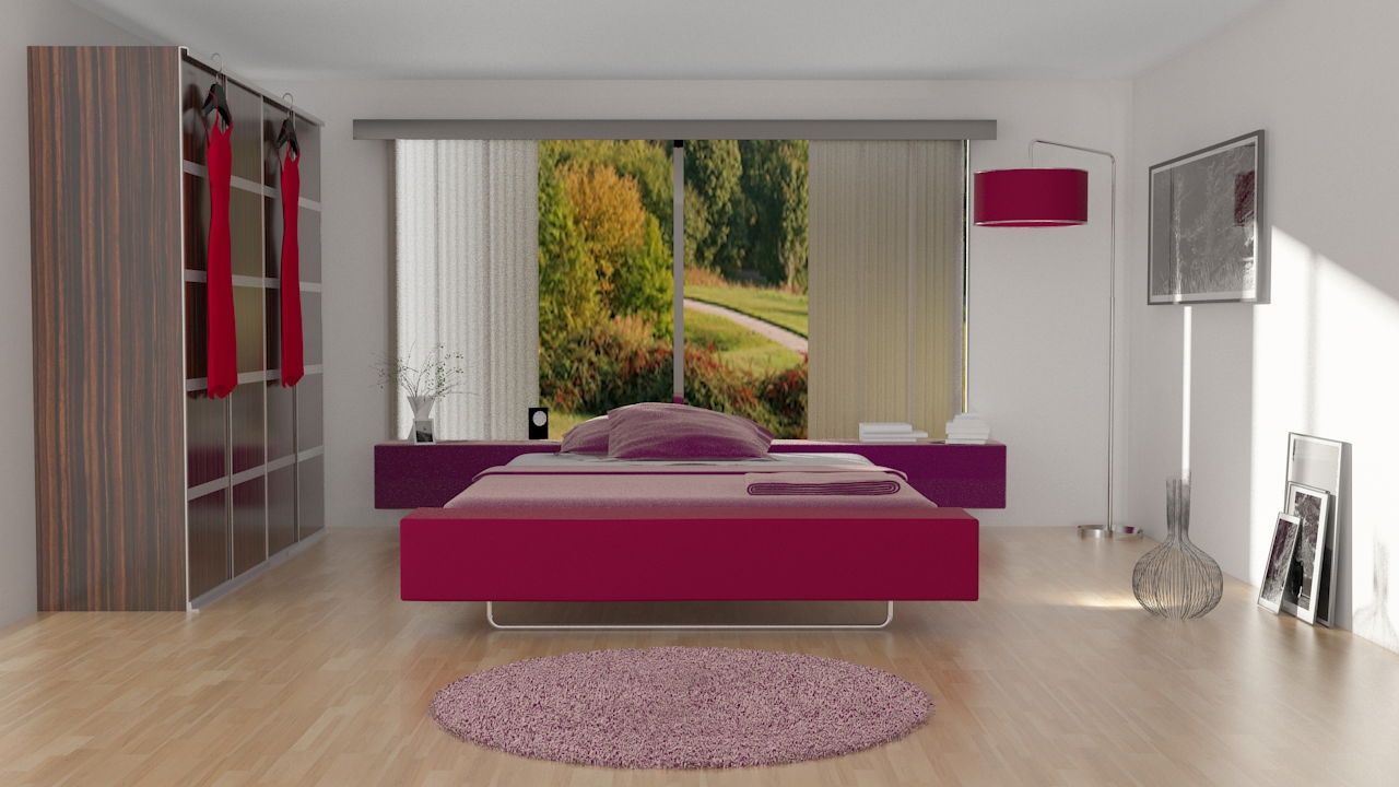 Ultra modern bright colored bedroom with Artistic back wall panels . soothing carpet and lighting, sky scrapper view.
