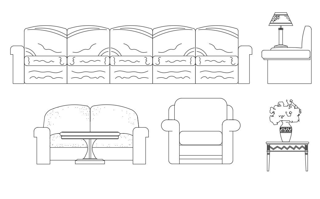 2d CAD drawing of sofa set elevation design CAD blocks that shows 5 seater, 2 seater and 1 seater with pounce back rest with is made in wooden. also has center table on lamp and flower pot. download free furniture sofa set up CAD blocks DWG file that use in living room and drawing room.