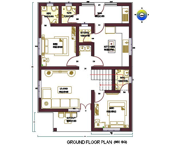 The architecture ground floor for plot size of 950 Sq Ft House Plan with east facing direction that shows 2 master bedrooms, kitchen, living room, store room and wash area. also has number of door and window marking detail. download house plan DWG file for collection of fabulous ideas that would serve as a good source of inspiration for new project drawing.
