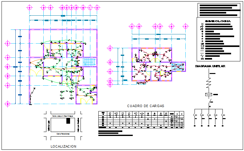 Electrical layout of house. Location available, electrical load table with symbols shown, Unifilar diagram, all electrical symbol available,house layout center line plan available in this file.