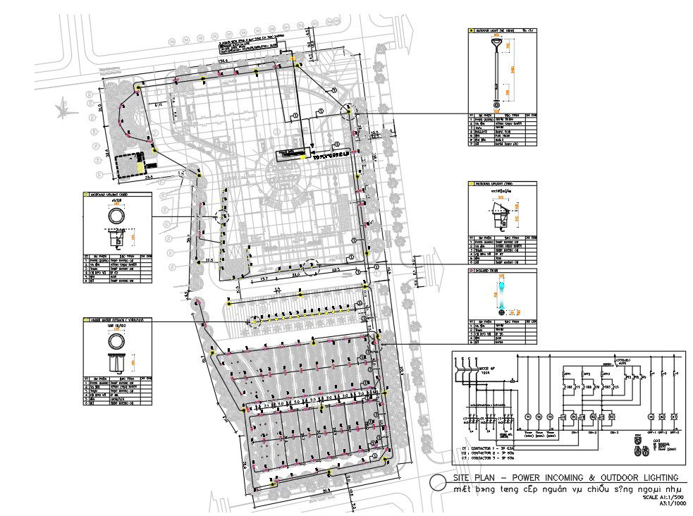 The drawing file shows the site plan details of the power incoming and outdoor lighting of the Marriage Hall.Download the AutoCAD drawing file.