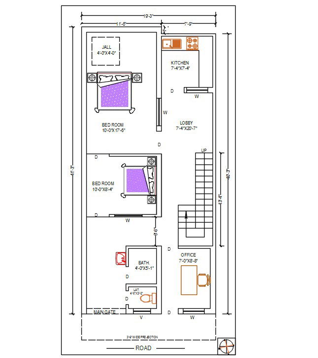 The architecture house ground floor plan 39' X 40' plot size with furniture layout drawing includes 2 bedrooms, toilet, kitchen, lobby, drawing room and staircase design DWG file. this is east facing direction house plan design DWG file.