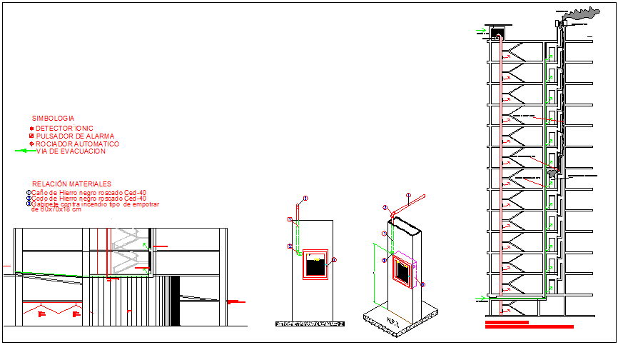 Layout of Flat drawing with the fire safety detail for all floor.Fire Safety installation detail available in this file.