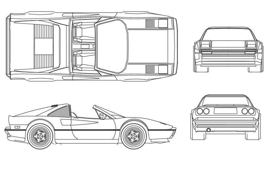 The sports car drawing top view, side elevation design, front and rear view design which consist 2 seater car, model, size and design. Download free sports car CAD blocks for using parking lot AutoCAD drawing.