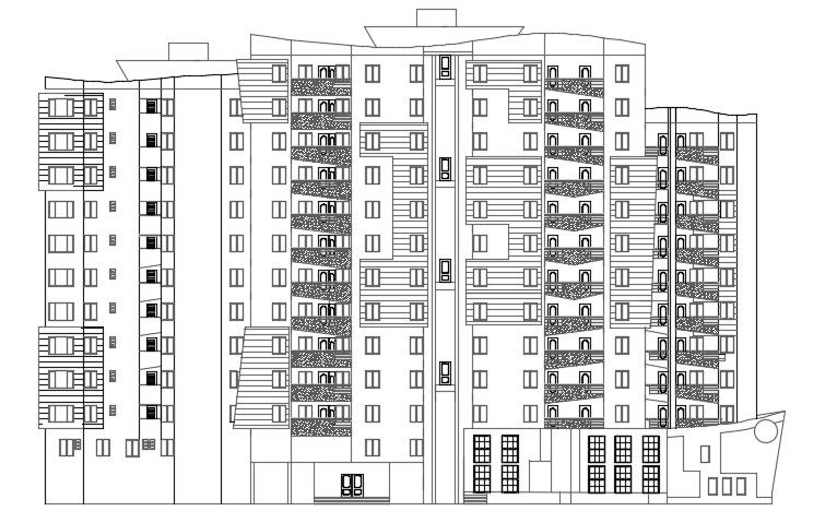 The multistory residence apartment building front elevation design in AutoCAD drawing that shows information of size and shape of external surface door window marking, height of building and finish of the building after completion visualization image. Download luxurious 2 BHK and 3 BHK apartment building design and use collect the CAD drawing for new project.