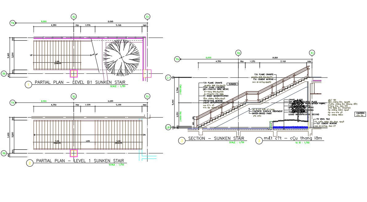 AutoCAD 2D drawing files having the detail of Side Elevation and partial section plan of Sunken Staircase 2d drawings. Download the DWG file.