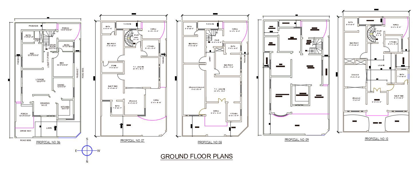 AutoCAD DWG file shows 40'X70'Five Various types of 2 BHK House plan Drawings. In all five plans building area is the same, room allocation and room sizes vary. In all plans master bedroom with attached toilet, Drawing room, Kitchen, Dining, TV Lounge, porch, and Lawn are available. The Staircase is placed inside of the house. Download the AutoCAD Drawing file. Thank you so much for Downloading AutoCAD DWG 2d files from our website.